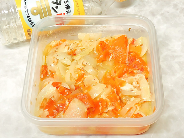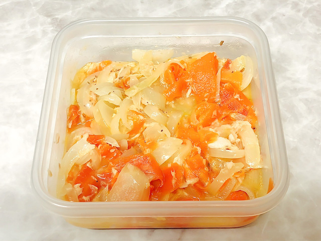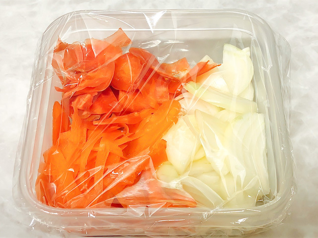 新玉ねぎ・にんじんを薄切りにして、ジップロックコンテナに入れる。
