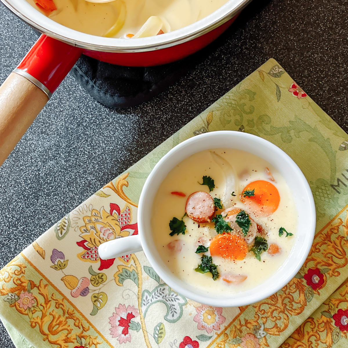 さらに、生クリームいらずで牛乳で作ることができるのもポイントです♪(通常、クリームスープを作るときには生クリームが必要ですよね。でも「クリームスープを作ろうかな〜」と思ったとき、だいたい我が家の冷蔵庫に生クリームは居ません。笑)